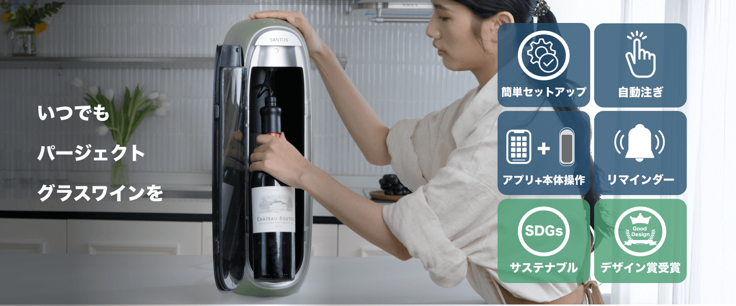 SANTUSはラテン語で「新鮮さ」を意味する、ワイン愛好家たちが集まり2016年に設立されたブランドです。私たちは、ワインラバーのみなさんにより快適なホームワインライフをお届けすること、そしてご家庭でのワインの廃棄量を減らし環境にやさしいリサイクル素材を使用することで、サスティナビリティの実現に取り組んでいます。