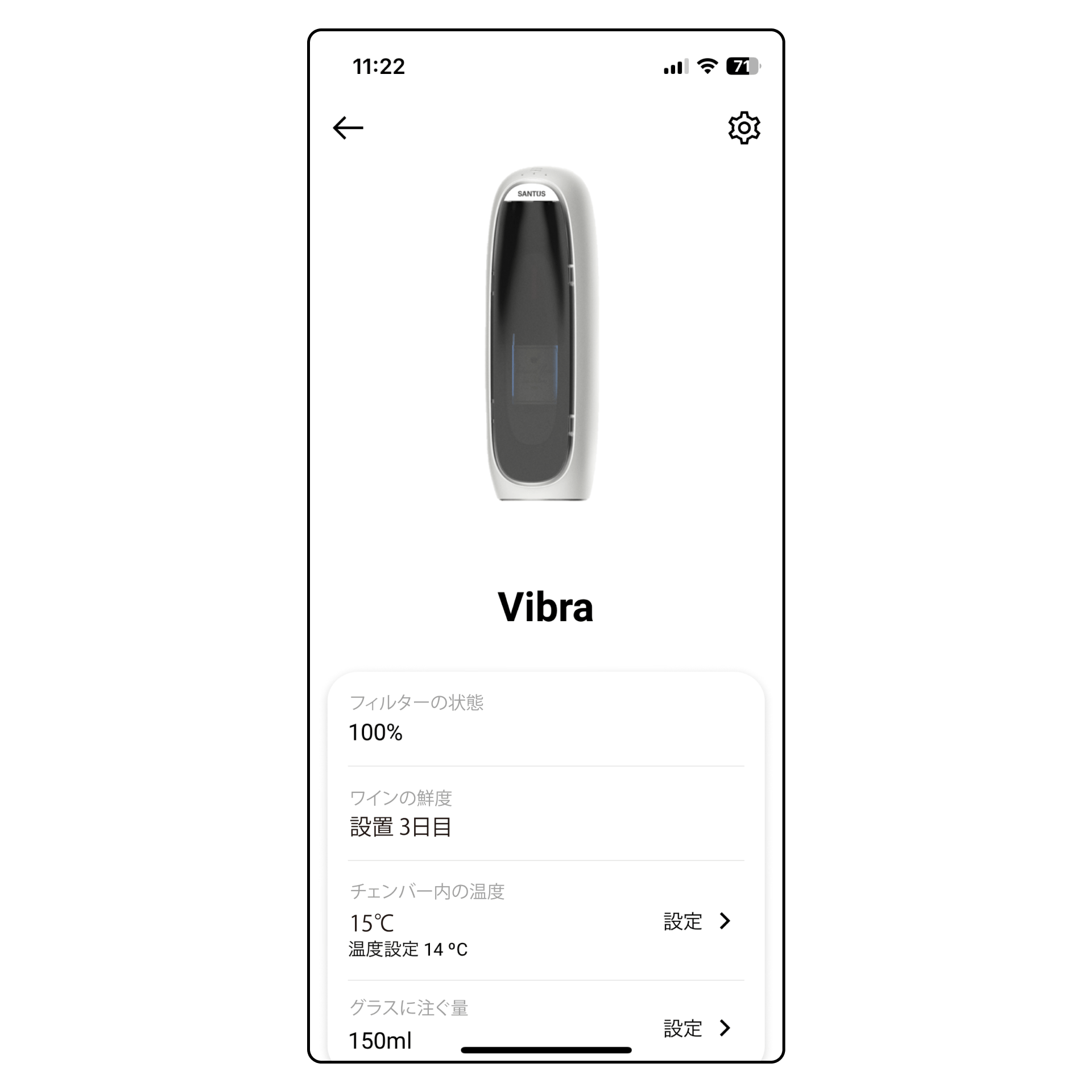 いつでもフレッシュなグラスワインを楽しみたい!そんなワインラバーの願いを叶えるために設立したワインアクセサリーブランド「SANTUS™︎」(サンタス)が提供する、ボトルを開封してから最長14日間、開けたてのテイストやアロマをキープできる、アプリ連動型ワインディスペンサー「Vibra」(バイブラ)です。